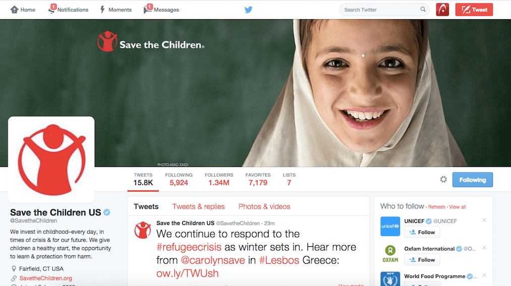 Social Media: Your nonprofit might not have the time to be on more than one or two social platforms; if you don’t, that’s okay! Regardless of how many social profiles you have, consistency is important. You can glean a lot from looking through what Rossetti and the team have done for Save the Children’s social media presence.