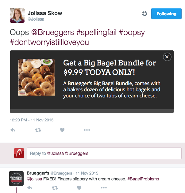 - First off, always reply to posts on your social media pages. You don’t want to miss the chance to respond to feedback or make your following feel appreciated. Take a look at “A Lesson in Customer Delight on Social Media from Bruegger’s Bagels“